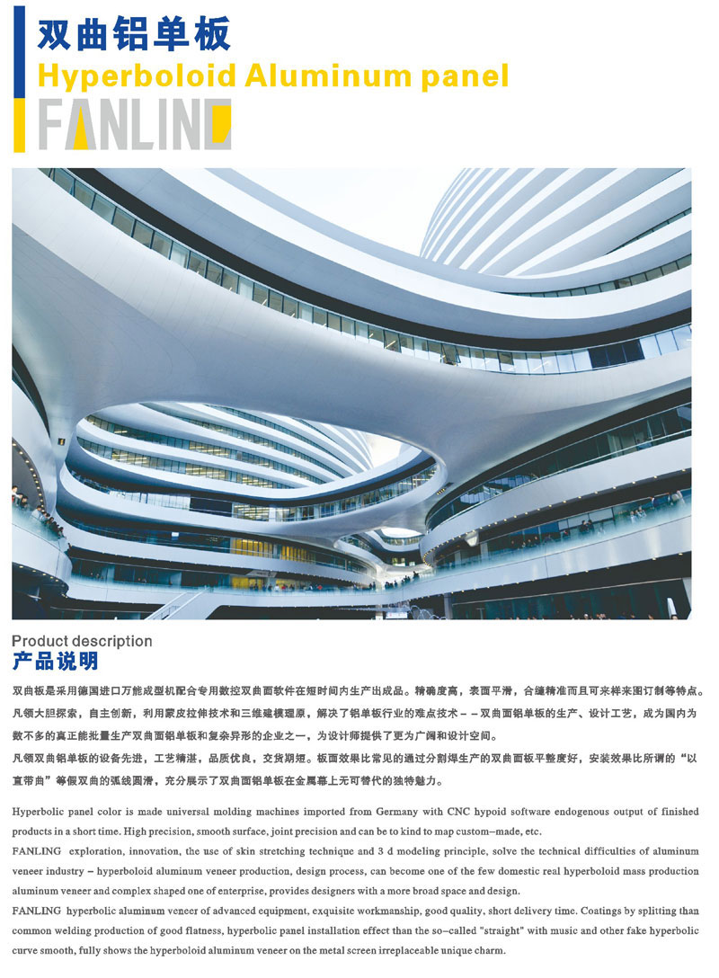 雙曲鋁單板:雙曲板是采用德國(guó)進(jìn)口萬(wàn)能成型機(jī)配合專用數(shù)控雙曲面軟件在短時(shí)間內(nèi)生產(chǎn)出產(chǎn)品。精確度高,表面平滑,合縫精準(zhǔn),造型獨(dú)特,為設(shè)計(jì)師提供了更為廣闊和設(shè)計(jì)空間。